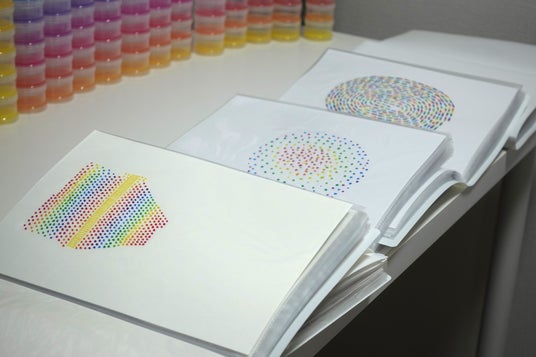 石川美奈子は、「自然の中にある色彩や光の移ろい」をインスピレーションの源とし、それを作品に反映させています。繊細な線の集合が織りなす複雑な色のグラデーションは、自然の中の微細な変化を表現し、観る者の心に静かな共鳴をもたらします。アクリルの透明感と色の重なりで、作品は光の角度によって異なる表情を見せ、立体的な感覚を生み出します。