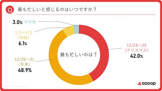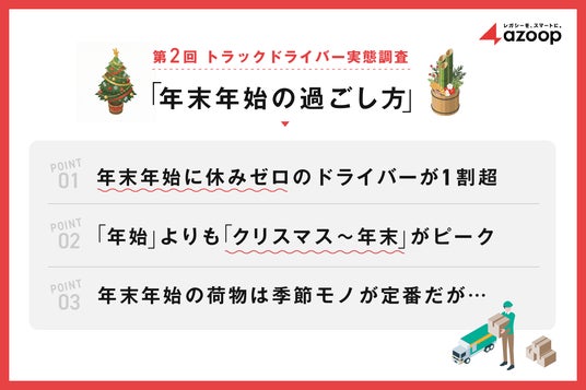 株式会社Azoop(本社:東京都港区、代表取締役社長: 朴 貴頌、以下「Azoop」)は、全国のトラックドライバーを対象に「年末年始の過ごし方」に関するアンケート調査を実施しました(有効回答数:155名)。その結果、「年末年始に全く休みがない」と答えた人が14.2%にのぼり、「クリスマス~年末が忙しい」と感じているドライバーが全体の9割を超えました。また、配送業務に関しては「おせち」「ケーキ」「クリスマスツリー」「プレゼント」など、季節感のある印象的な荷物に関するエピソードも数多く寄せられました。