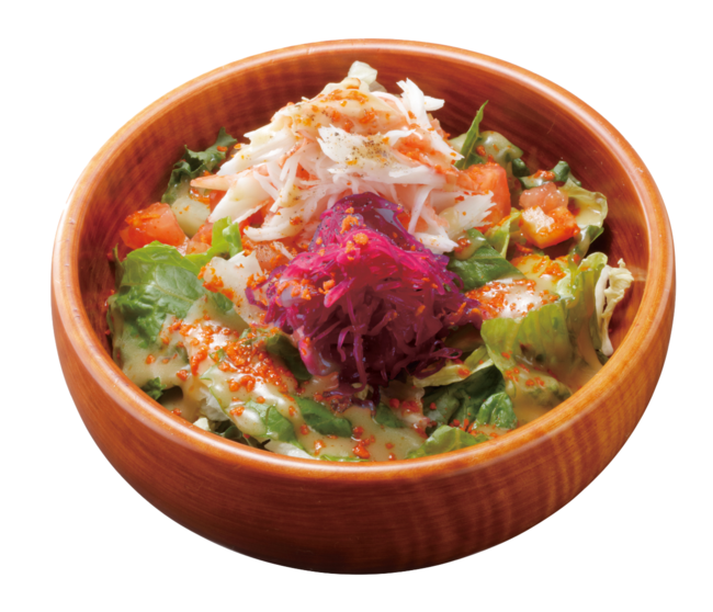 クリーミーな醤油ベースのソイドレッシング。トマト・カニカマに紫キャベツのピクルスがアクセント。ケール入りです。