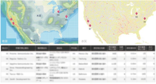 ・拠点リスクマッピング(国内/海外):地図上で拠点をマッピングし、各リスク事象とその程度による影響の見込みを可視化(下図は地震と水害の例)