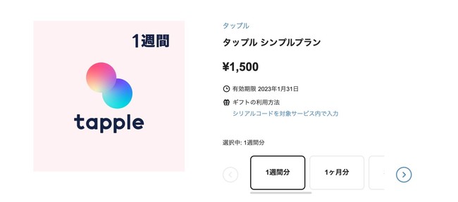 「giftee(R)︎」にて、「タップル」の有料プランをご利用いただける5種類のeギフトを販売いたします。購入された方は、eギフトをご友人にLINEやメールなどでお贈りいただけます。友だち同士で気軽に贈り合えるよう、1,500円で購入可能な「タップル」1週間プランも提供いたします。