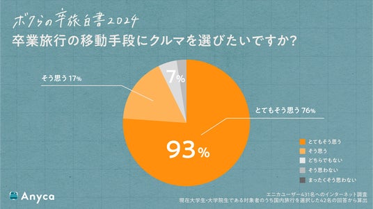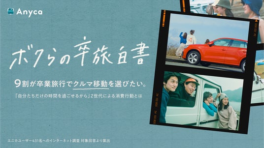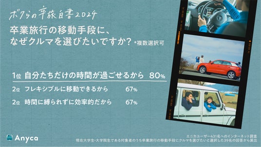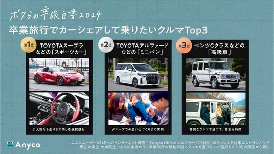 株式会社DeNA SOMPO Mobilityは、開発・運営するカーシェアサービス「エニカ(Anyca)」の431名 のユーザーを対象に卒業や新生活に関するアンケート調査を実施し、第一弾として「ボクらの卒旅白書2024」を発表します。これから卒業旅行をする大学生・大学院生や35歳までの若年層が経験した卒業旅行について実態をまとめた調査レポートです。今回の調査では、大学生・大学院生のうち9割以上が卒業旅行の移動手段にクルマを希望していることがわかりました。その理由でもっとも多かったのは「自分たちだけの時間を過ごせるから」です。また、卒業旅行で行きたいともっとも選ばれたのも「ドライブ」です。Z世代による消費行動の特徴がこれらの結果に表れました。エニカでは、レンタカー形態のカーシェアとして、ミニバン・スポーツカー・高級車などの「Anyca Official シェアカー」を提供しています。ブランドコンセプト「クルマが変われば、思い出が変わる」のもと、思い出づくりまで楽しめる移動をカーシェアを通じてお届けし、大学生や大学院生の方々がより充実した卒業旅行の時間を過ごせるようサポートしていきます。