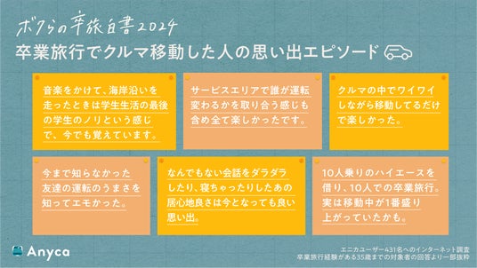 35歳までの卒業旅行経験者を対象にした「学生時代の卒業旅行のクルマ移動中の楽しかったエピソードを聞かせてください。」 という項目では、クルマで移動したからこそ卒業旅行が充実した思い出を思い思いに回答してくれました。*