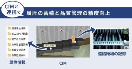 遠隔臨場で得た記録(映像、音声、チャットなど)と、CIM 上の施工履歴(出来形情報、変更情報など)を紐づけて管理することで、一元的に情報を振り返れるようになります。また、遠隔臨場の映像だけでは見落としがちな細かい施工条件を、CIM モデルと照らし合わせることで確実に管理できます。