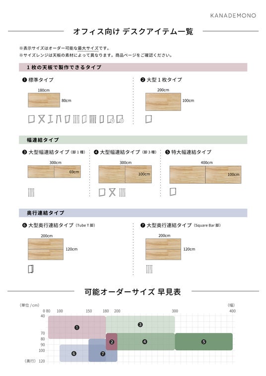 デスクワーク用に最適な天板を使用した大型テーブルのラインナップ。フリーアドレスのデスクやミーティングテーブルにもぴったりなこちらのテーブルは、最大幅300cm ・ 最大奥行120cmまで無料サイズオーダーが可能です。