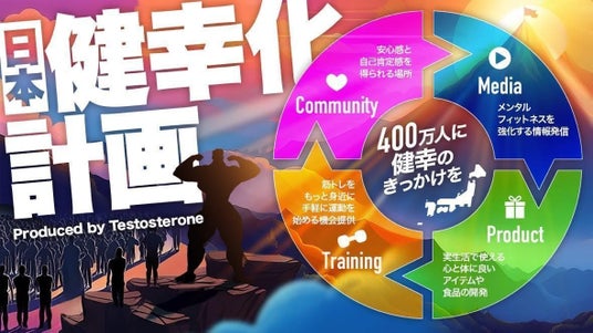 Testosterone氏が人生を賭けて推進する、全国民の「健幸」実現を目指す社会プロジェクトです。「健幸」とは、病気でない状態にとどまらず、自分を好きになり、笑顔で日々を過ごせ、支え合える仲間がいる幸福な状態を指します。