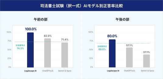 LegalscapeのAIは、午前の部(配点105点)で満点となる105点(正答率100%)、午後の部(配点105点)で84点(正答率80%)を記録し、双方の合格基準点を大きく上回りました。