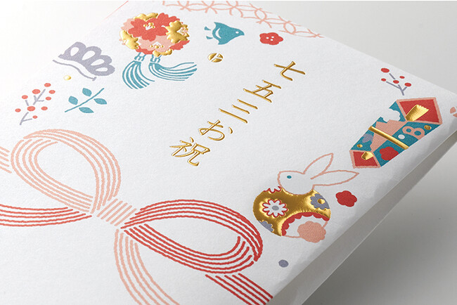 『七五三お祝多当』は、表書きや絵柄に立体感のある箔押しエンボスを施し華やかな雰囲気に仕上げています。また本体に描かれているイラストは長寿や幸福を意味する縁起物がモチーフとなっており、子どもの健やかな成長を祝う気持ちを込めてデザインされました。