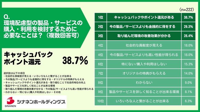 ・環境配慮型の製品・サービス未利用者(n=222)の約4割(38.7%)が、キャッシュバックやポイントなどの経済的なメリットが利用を検討するにあたり必要と回答。
