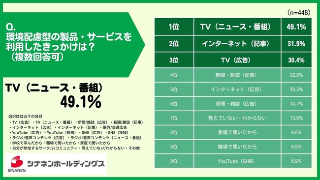 ・環境配慮型の製品・サービス利用者(n=448)の約半数(49.1%)がTV番組をきっかけに行動。
