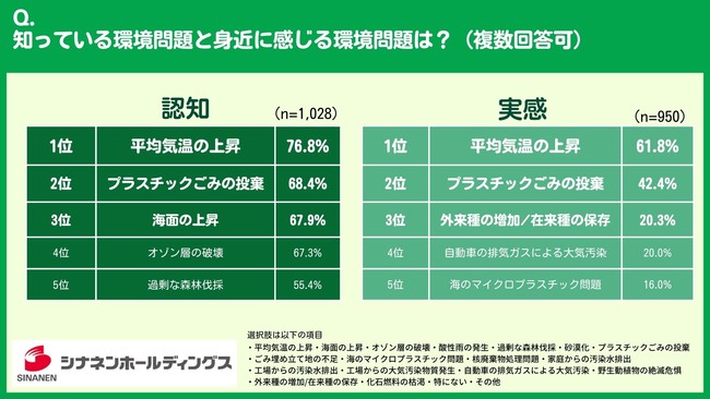 ・認知および実感している環境問題1位は「平均気温の上昇」。