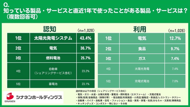 それぞれの環境配慮型の製品・サービスに関する認知と利用経験を聞いたところ、認知が一番高かったのは「太陽光発電」で43.4%、次いで「電気」の36.7%となりました。利用経験が一番高かったのは、「電気」の12.7%となっています。