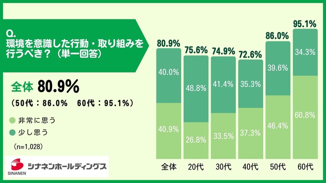 次に、一人ひとりが環境問題を意識した行動や取り組みを行うべきか尋ねたところ、全体で8割以上の方が、取り組みを行うべきと考えていることが分かりました。年代別で見てみると、50代が86.0%、60代では95.1%と、特に年齢の高い方が環境を意識した行動を行うことに積極的な姿勢であることが伺えます。