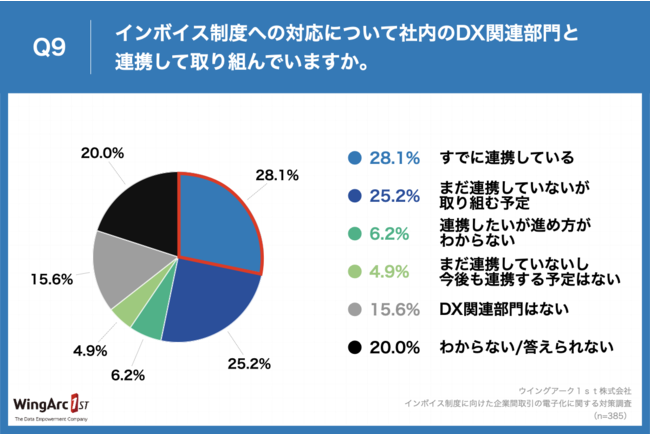 「Q9.インボイス制度への対応について社内のDX関連部門と連携して取り組んでいますか。」(n=385)と質問したところ、「すでに連携している」が28.1%、「まだ連携していないが取り組む予定」が25.2%という回答となりました。