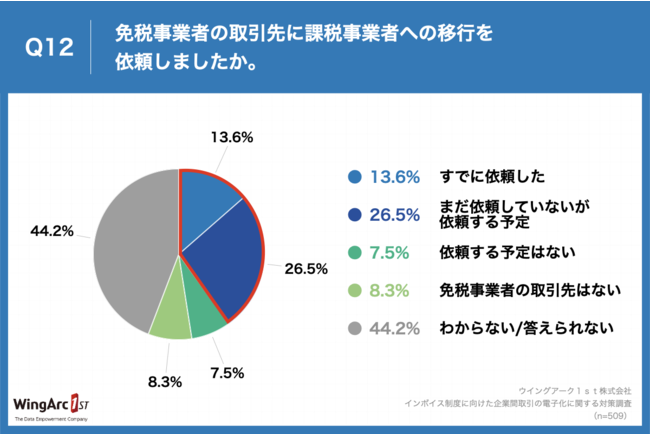「Q12.免税事業者の取引先に課税事業者への移行を依頼しましたか。」(n=509)と質問したところ、「すでに依頼した」が13.6%、「まだ依頼していないが依頼する予定」が26.5%という回答となりました。