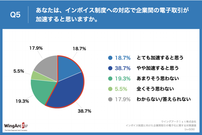 「Q5.あなたは、インボイス制度への対応で企業間の電子取引が加速すると思いますか。」(n=509)と質問したところ、「とても加速すると思う」が18.7%、「やや加速すると思う」が38.7%という回答となりました。