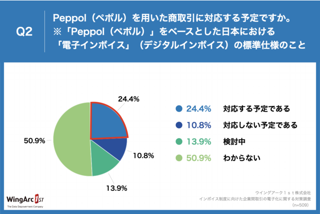 「Q2.Peppol(ペポル)を用いた商取引に対応する予定ですか。※「Peppol(ペポル)」をベースとした日本における「電子インボイス」(デジタルインボイス)の標準仕様のこと」(n=509)と質問したところ、「対応する予定である」が24.4%、「対応しない予定である」が10.8%という回答となりました。