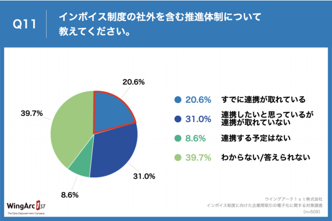 「Q11.インボイス制度の社外を含む推進体制について教えてください。」(n=509)と質問したところ、「すでに連携が取れている」が20.6%、「連携したいと思っているが連携が取れていない」が31.0%という回答となりました。