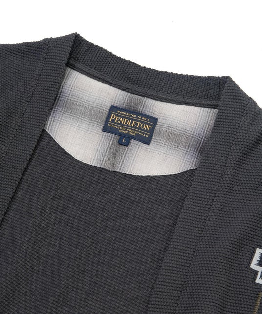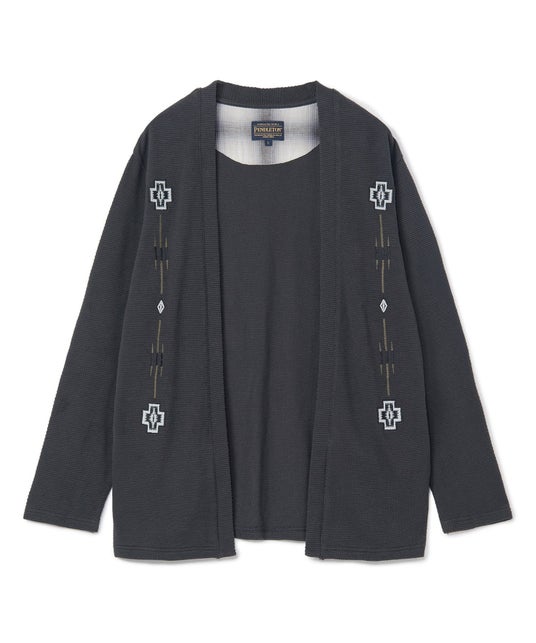 PENDLETONのインラインTシャツを着想源に、MEN'S BIGIで高い支持を得ている定番カーディガンの型へ落とし込んだ特別仕様の一着。軽やかな鹿の子素材と、ブランドを象徴するネイティブ柄刺繍が、大人のカジュアルスタイルにさりげない個性を添えます。