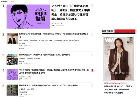 ファッション業界専門紙「WWDJAPAN」のウェブサイトで連載中のマンガ版『在庫管理の魔術』が、 第1話、第2話(1月18日公開)とも同サイトのデイリーランキングで2週連続1位を獲得しました。