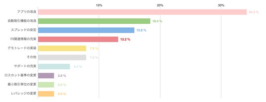 アンケートによれば、「アプリの機能を強化してほしい(34.2%)」「自動取引機能をより使いやすくしてほしい(18.4%)」「スプレッドを安定させてほしい(15.8%)」「FX関連情報を充実させてほしい(13.2%)」といった様々な意見が寄せられた。