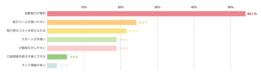 アンケートによれば、「自動取引の利便性」を挙げた投資家が54.1%で最も多く、次いで「取引ツールの使いやすさ(24.3%)」「取引時のコストを抑えられる(21.6%)」といった点も取り上げられている。