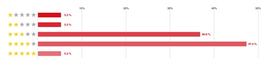 アンケートによれば、みんなのシストレに対する評価は高評価と低評価のそれぞれに分かれる結果となった。4点をつけたユーザーの割合が47.4%で最も高い一方で、最高評価の5点と低評価の2点、最低評価の1点の割合がそれぞれ5.3% で並んでいる。