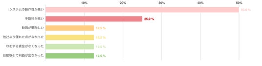 アンケートによれば、みんなのシストレでのFX取引をやめた理由としては「システムの操作性の悪さ」を挙げたユーザーの割合が50.0%で最も多かった。