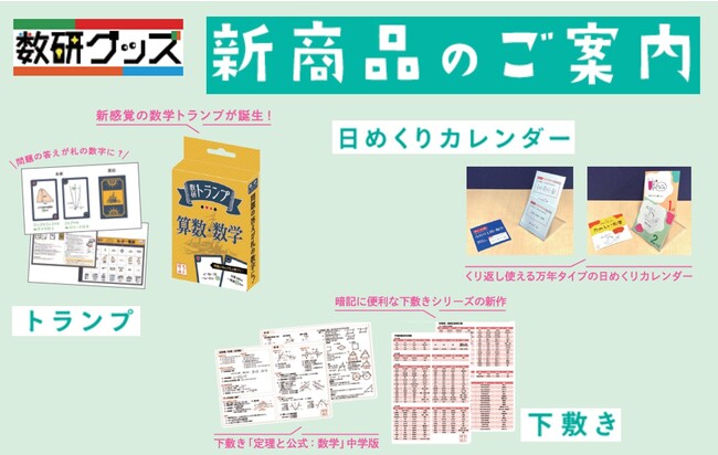 “学び”に関するデザインを取り入れ、日常を楽しくする「数研オリジナルグッズ」。第10弾として、トランプ、下敷き、日めくりカレンダーが新たにラインアップに加わります。