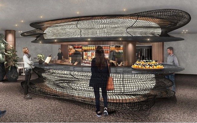 店内中央に位置するバーカウンターは、琵琶湖の形状や比良山地の等高線といった、大自然から生まれた力強く有機的なフォルムをモチーフとしたデザインとすることで、新たに生まれ変わるダイニング全体に躍動感を与え、かつシンボルとしての存在感を持たせました。