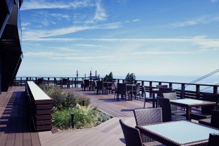 南側の折れ戸の先にはロープウェイや蓬莱山の景色が広がるなど、眺望とともにお食事をお楽しみいただけるテラス席があります。