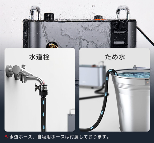 「F1」は水道と接結するだけではなく、水道から離れた場所でホースの長さが足りない場合は、短時間でポンプへ吸水できる「自吸機能」を利用できます。水道水の代わりに雨水などの溜め水を吸い上げて、高圧洗浄できます。