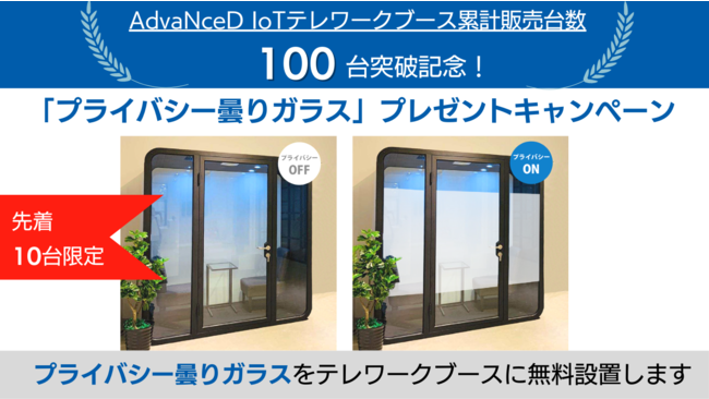 株式会社デバイスエージェンシー(所在地:大阪市西区)が企画・販売する「AdvaNceD IoTテレワークブース」の販売台数が累計100台を突破しました。これを記念して、先着10台限定で「AdvaNceD IoTテレワークブース」にオプションの「プライバシー曇りガラス」を無料設置するプレゼントキャンペーンを5月12日から開始しました。