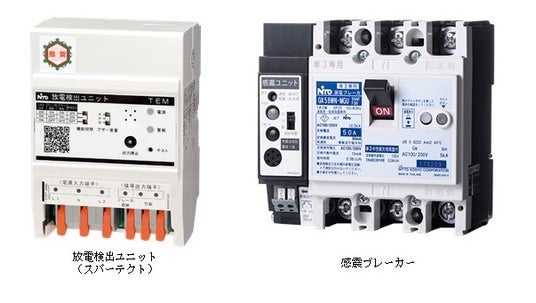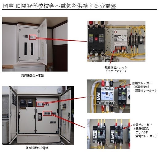 設置された場所は、旧開智学校校舎に電気を供給する分電盤です。スパーテクトは、家屋内のトラッキングやケーブル断線、ショート(短絡)などで発生する火花放電を当社独自技術により検出し、電気火災を未然に防止する日本初の製品です。感震ブレーカーは、大地震発生時に設定値以上の揺れを感知したときに、ブレーカーやコンセントなどの電気を自動的に止める器具です。感震ブレーカーの設置は、不在時やブレーカーを切って避難する余裕がない場合に電気火災を未然に防止する有効な手段です。
