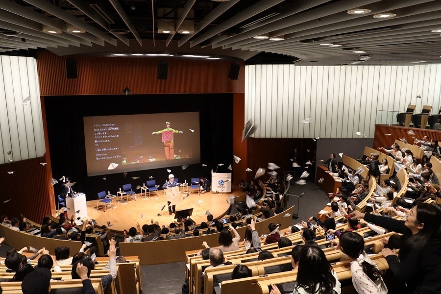 参加者に紙飛行機を折っていただき、全員一斉に舞台の的に向かって飛ばします。