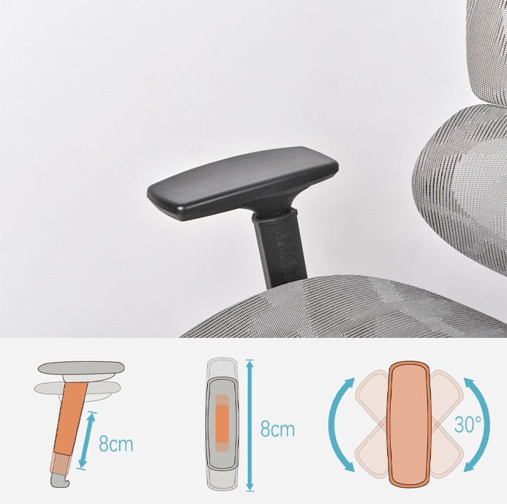 アームレストはチェアの中では比較的小さい部品ですが、腕の重さを支え、肩を適切な位置に保つための重要な要素。作業中や休憩中に最も快適なポジションに調整するため、前後、左右、上下に簡単にスライドできます。