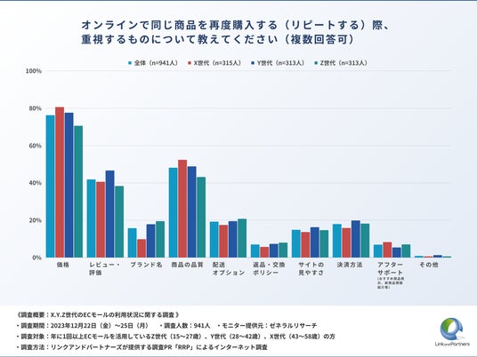 また、オンラインでのリピート購入に関しては、全世代共通して価格を最も重要視していますが、項目別で見ると、商品の品質はX世代、レビュー・評価はY世代、ブランド名はZ世代が最も重要視していると言えるでしょう。