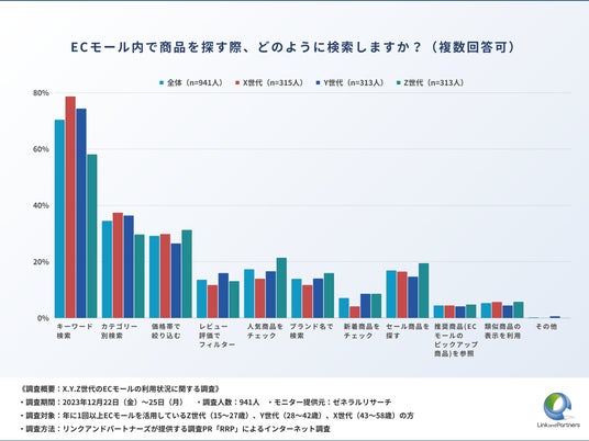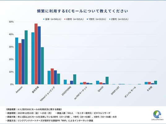 そこで今回、株式会社リンクアンドパートナーズは、年に1回以上ECモールを活用しているZ世代(15~27歳)、Y世代(28~42歳)、X世代(43~58歳)の方941名を対象に、「X.Y.Z世代のECモールの利用状況に関する調査」を実施しました。