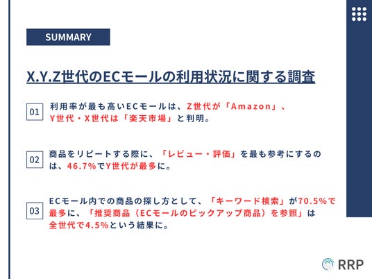 ・利用率が最も高いECモールは、Z世代が「Amazon」、Y世代・X世代は「楽天市場」と判明。