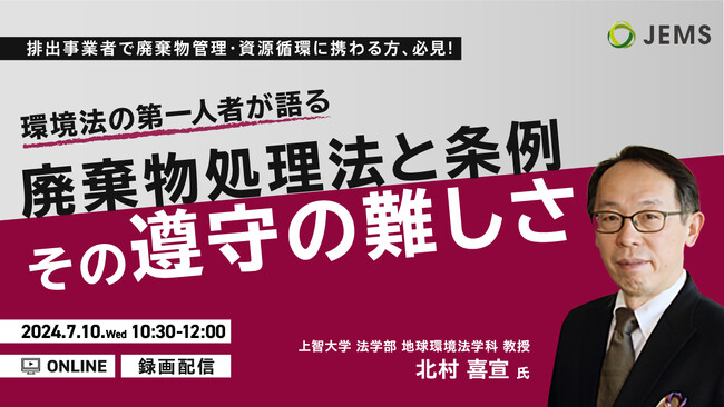 「ITで環境問題に挑む」をコーポレートスローガンに掲げる株式会社JEMS(本社:茨城県つくば市、代表取締役:須永裕毅)は、2024年7月10日(水)に「廃棄物処理法と条例」をテーマとした無料オンラインセミナーを開催します。