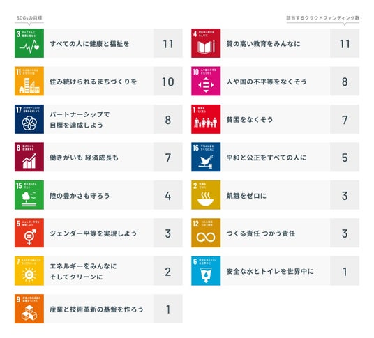 「GIVING for SDGs」では、団体様が挑戦するクラウドファンディングに該当するSDGsの目標を複数、回答いただいています。下記の様に、多くのSDGsの目標に寄与することができました。