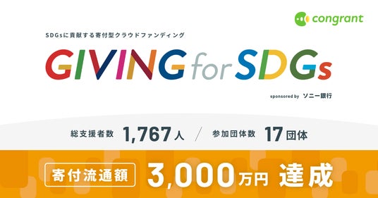 NPO・ソーシャルセクター向け寄付決済システムのコングラント株式会社(本社:大阪市西区、代表取締役:佐藤 正隆)は、ソニー銀行株式会社(代表取締役社長:南 啓二/本社:東京都千代田区)の協賛で運営するSDGsを推進するNPOのクラウドファンディングを支援するプログラム「GIVING for SDGs」にて、寄付流通額3,000万円を突破したことをお知らせします。