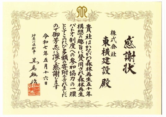 リビングライフホールディングスで木造戸建てを分譲する株式会社東横建設(本社:東京都大田区、代表取締役:樋口朗)は、この度、神奈川県の「森林再生パートナー」制度に係る寄附を行い、神奈川県黒岩知事より感謝状をいただきました。
