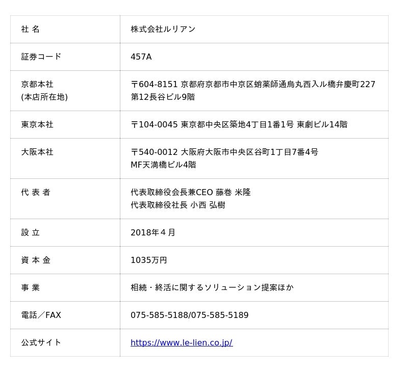 相続・終活に関するプラットフォーム事業を展開する株式会社ルリアン(京都府京都市、代表取締役会長兼 CEO・藤巻 米隆 / 以下、当社)は、2026年4月2日をもちまして、創業8周年を迎えます。これに伴い、さらなる事業拡大と営業力の強化を目的に、登記上の本店である京都に加え、同日付で東京・大阪を加えた3本社体制とすることになりました。祖業の縁故地である京都をベースとして、東西の営業拠点を本社に昇格させることで、相続・終活プラットフォームの普及を加速させてまいります。