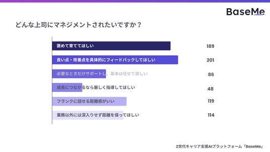 理想のマネジメントスタイルを尋ねたところ、全体450名のうち201名が「良い点・改善点の具体的なフィードバック」189名が「褒めて育てて欲しい」と回答し、圧倒的な支持を集めました。