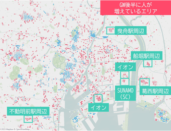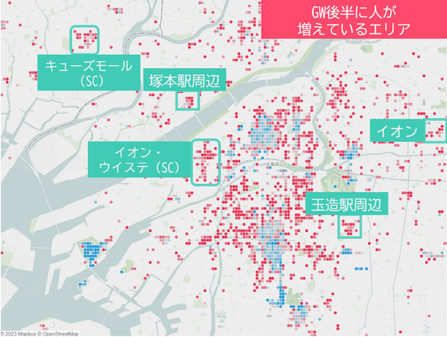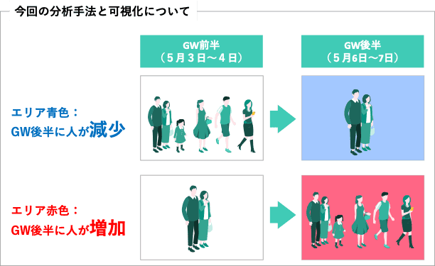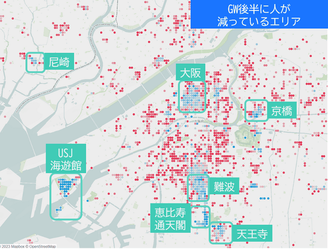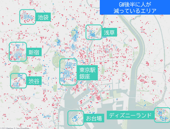 交通移動の要所となる大きなターミナル駅やその周辺、テーマパークや観光地は、GW後半に人が減少しているという結果が分かりやすく現れています。