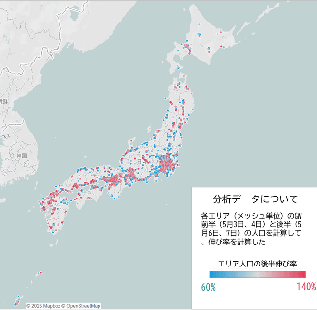 日本全体で見てみると、大都市圏は後半伸び率が高く、郊外は後半の伸び率が低いエリアが多いということが分かりました。この結果から、GWの前半は帰省や観光、旅行などで都市圏外に人が集まり、後半は人々が都市圏に戻ってきたことが考えられます。実際に後半の伸び率が低い地域を拡大すると、有名観光地が多い傾向となっていました。