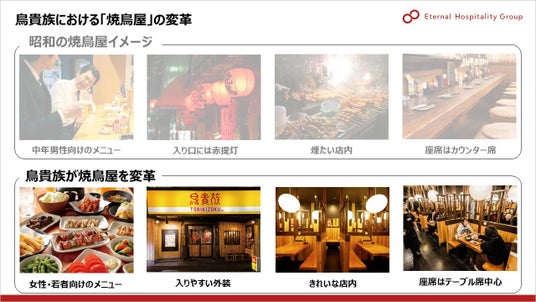 鳥貴族は、「焼鳥屋」を変革しました。従来の“焼鳥屋”のイメージを刷新し、女性・若年層にも開かれた明るい店づくり、メニューの見直し、テーブル中心の座席設計を行いました。