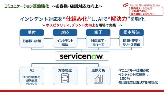 お客様対応力向上という観点で、店舗発のインシデント(トラブル・苦情)対応をメール起点からServiceNowへ切り替え、現場マニュアルをシステム化することで、進捗と根本原因の解決プロセスを可視化する取り組む予定です。
