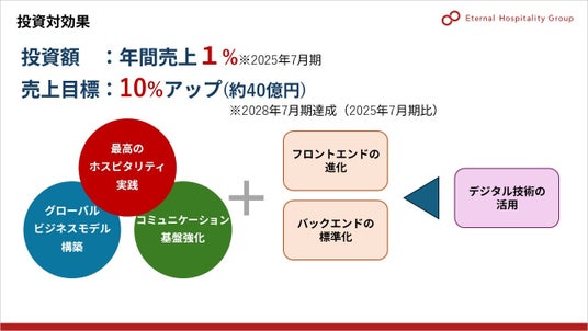 「売上1%のDX投資で売上+10%」を掲げ、2025年7月期に年間売上の1%をDX投資として確保し、予約強化やレコメンド最適化などの顧客接点施策を実装することで、2028年7月期までに売上10%増(約40億円)を目指します。